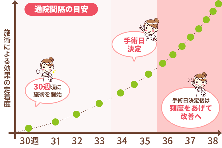 37〜38週で帝王切開の手術となりますが、34〜35週で手術日が決まる事が多いので、決まれば頻度を上げて週3〜5回に増やして施術します。