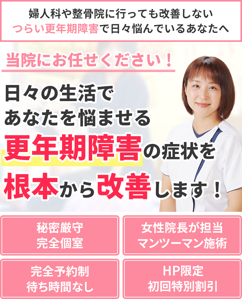 当院では、丁寧な問診と徹底した検査によって全身の状態を確認した上で、「自律神経の乱れ」を整えるために、必要部位に対して施術を適宜行い、あなたを苦しめる更年期の症状を改善いたします。